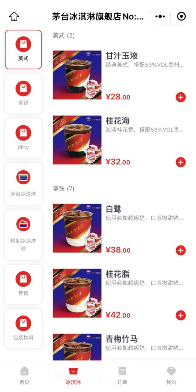 比如,茅台此前推出了冰淇淋,其中的经典原味款,小程序售价66元一杯;同时,其在三个月前,还在茅台冰淇淋小程序,上线了咖啡类产品,其中最便宜的“甘汁玉液”,售价28元一杯。