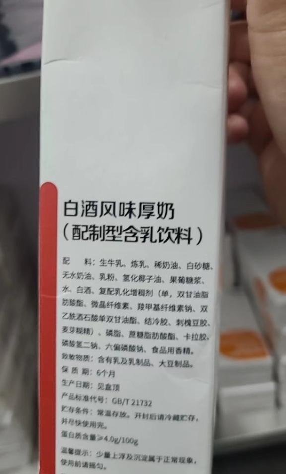 潘哥在网上找到了白酒风味厚乳的配料表,发现上面共显示有17种配料,其中白酒排在第10位,而排在前面的配料,分别为生牛乳、炼乳、稀奶油、白砂糖等。