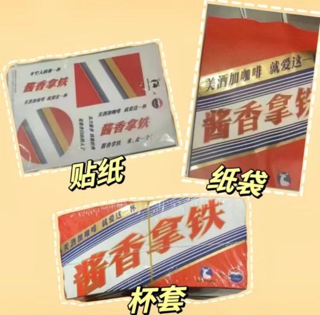 潘哥发现,这次瑞幸和茅台联名,推出了贴纸、纸袋和杯套三件套,设计风格与茅台十分接近,上面写着“美酒加咖啡,就爱这一杯”“酱香拿铁,来,走一个?”