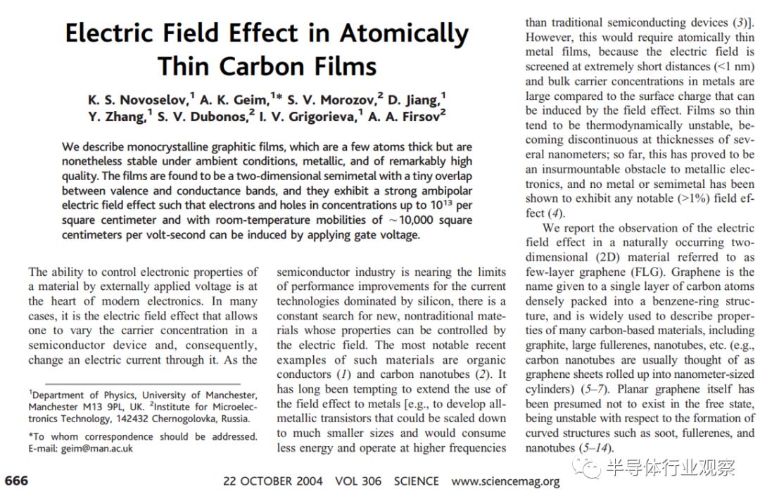 2004年10月发表在Science杂志上的石墨烯材料论文