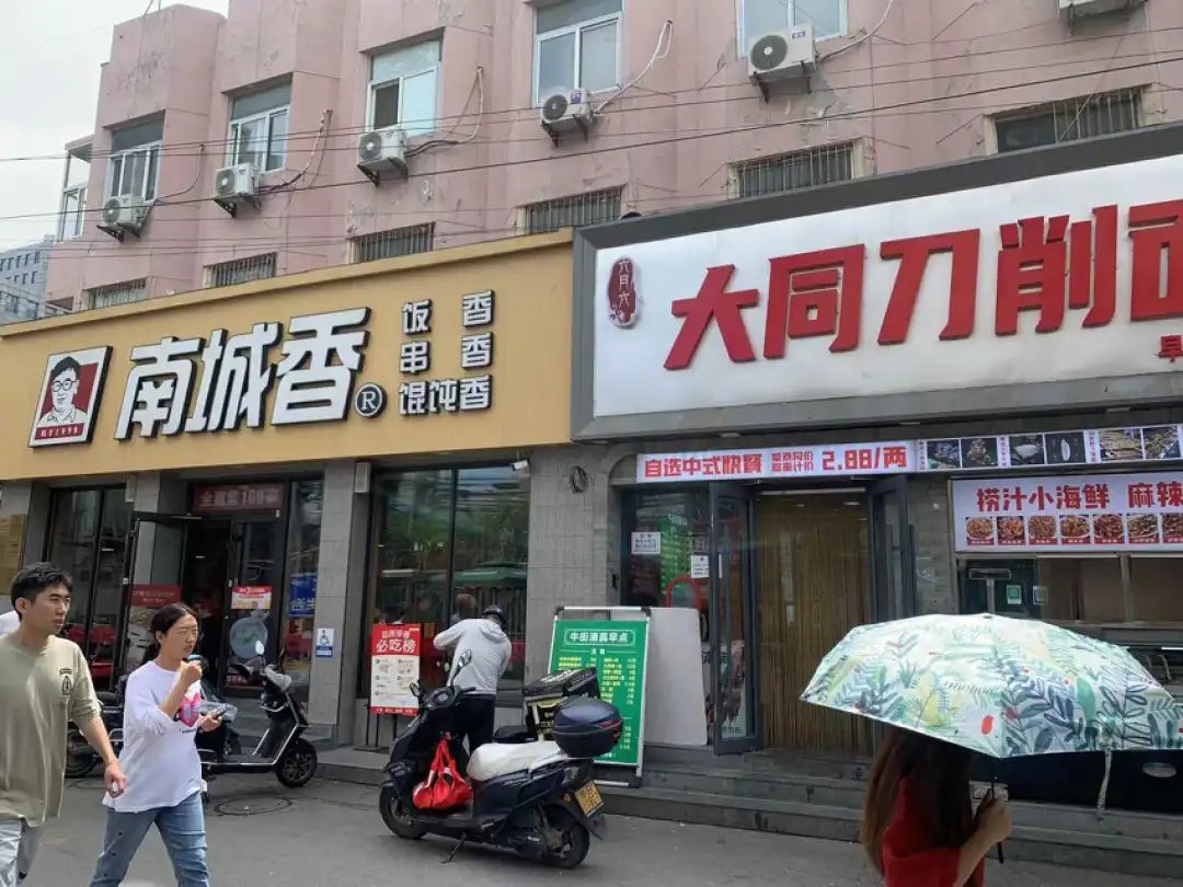 南城香一墙之隔是一家大同刀削面,早餐时段做“牛街清真早点”。有着北方人更常见的早餐选择,同时,豆浆、粥、鸡蛋汤免续,价格分别是2.5元、3元和5元。价格上,仍有一定优势。