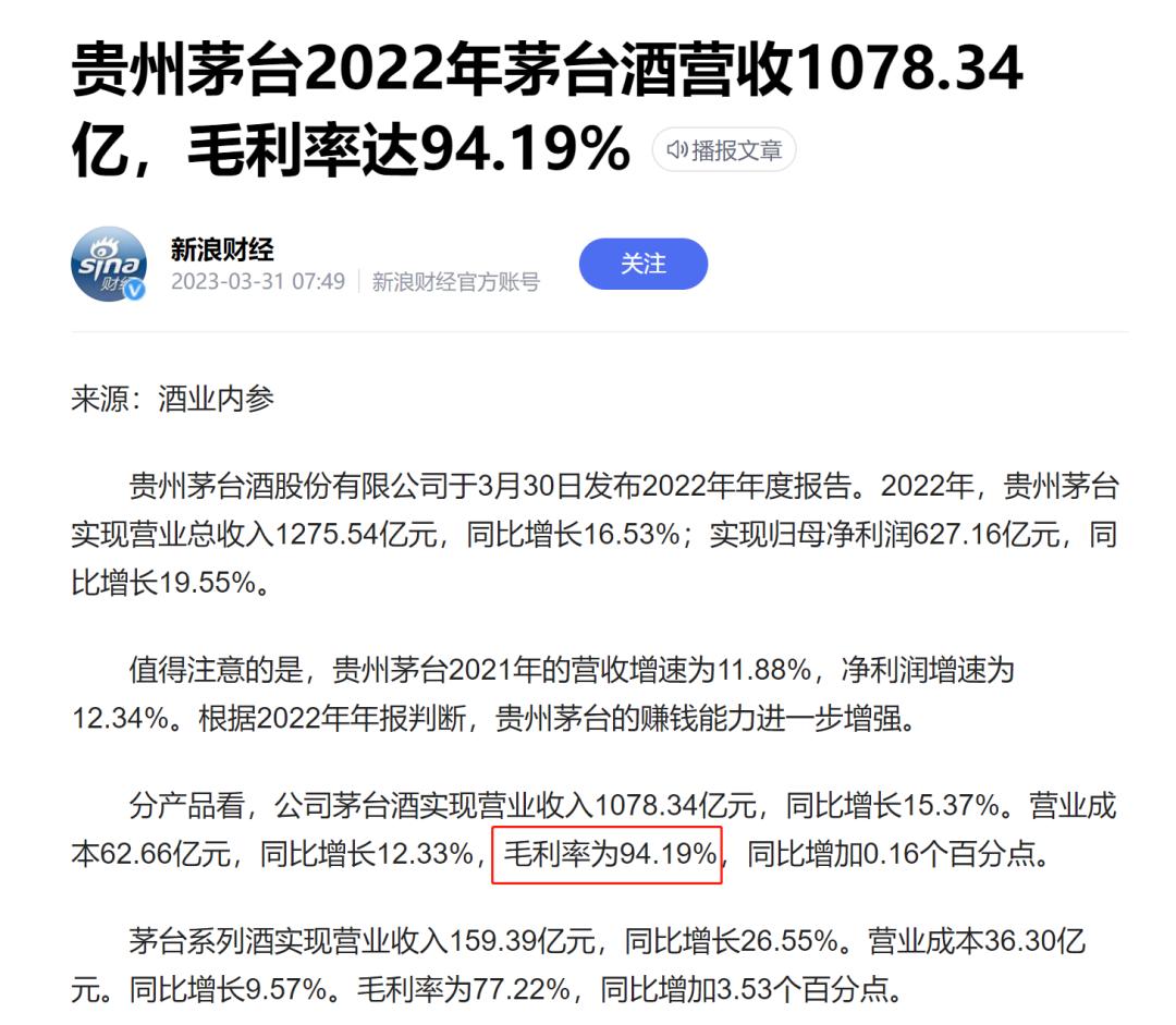 茅子哥的毛利率是94.19%,不是因为茅子哥不完美,是因为数学还有极限而已。