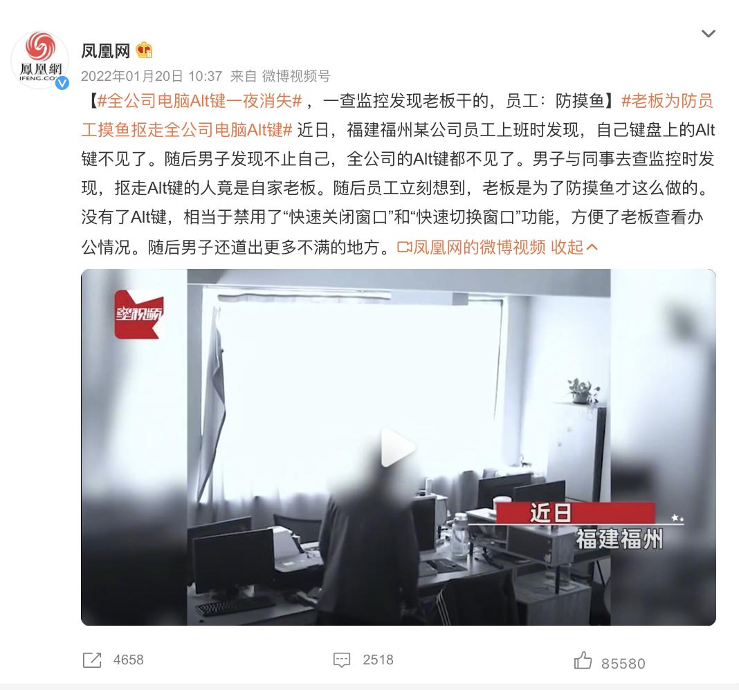 但现实往往来得更玄幻,在去年有位福建老板,不知道从哪里来的灵感,一夜之间亲手给全公司的电脑alt键盘全部扣走,后来员工们调监控才发现,捣蛋包原来是自己的老板,仔细询问是老板怕员工摸鱼使用快捷键切换电脑桌面...