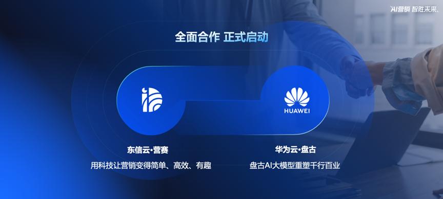 东信云与华为云的合作旨在发挥各自优势, 基于华为云盘古大模型,结合东信在营销领域的1500亿大数据沉淀和19年行业经验,打造营销垂直领域的行业大模型——营赛洞见。