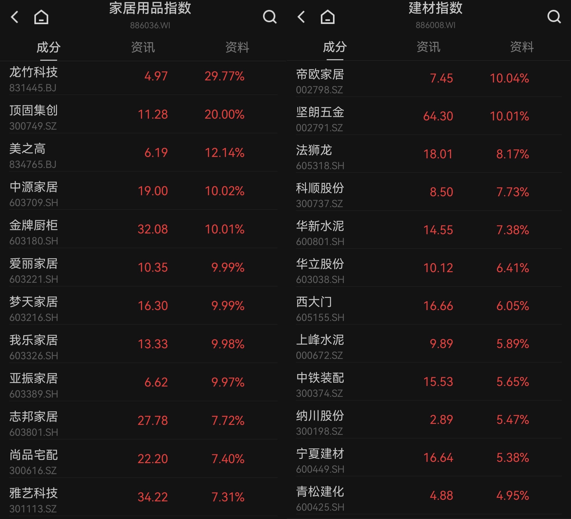 地产产业链持续回暖,家居、建材股集体走高;我乐家居6连板,中源家居、金牌橱柜、爱丽家具、梦天家居、亚振家、帝欧家居涨停,美之高涨超10%。