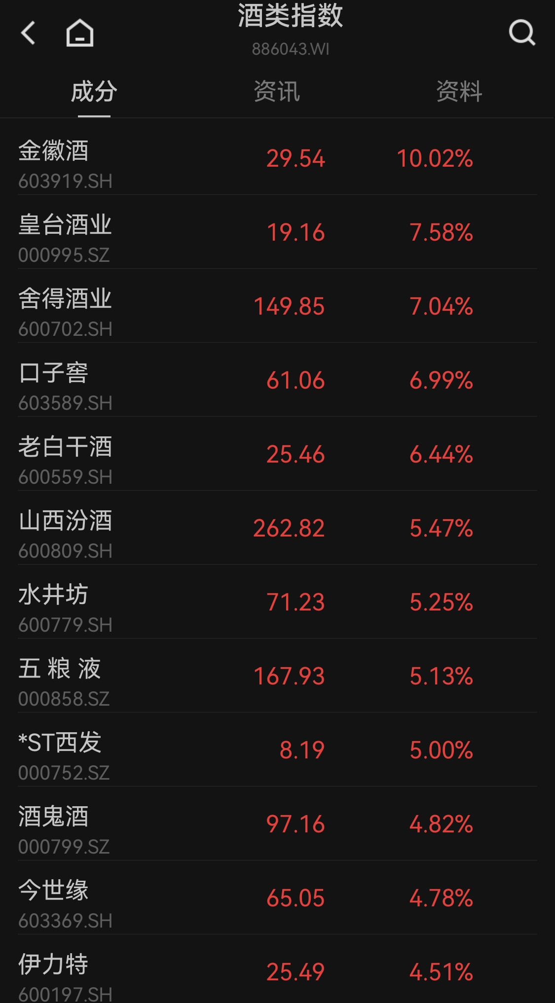 白酒股走势大幅活跃,金徽酒封板,皇台酒业、舍得酒业、口子窖、老白干酒涨超6%,山西汾酒、水井坊、五粮液涨超5%,迎驾贡酒盘中刷新历史新高。