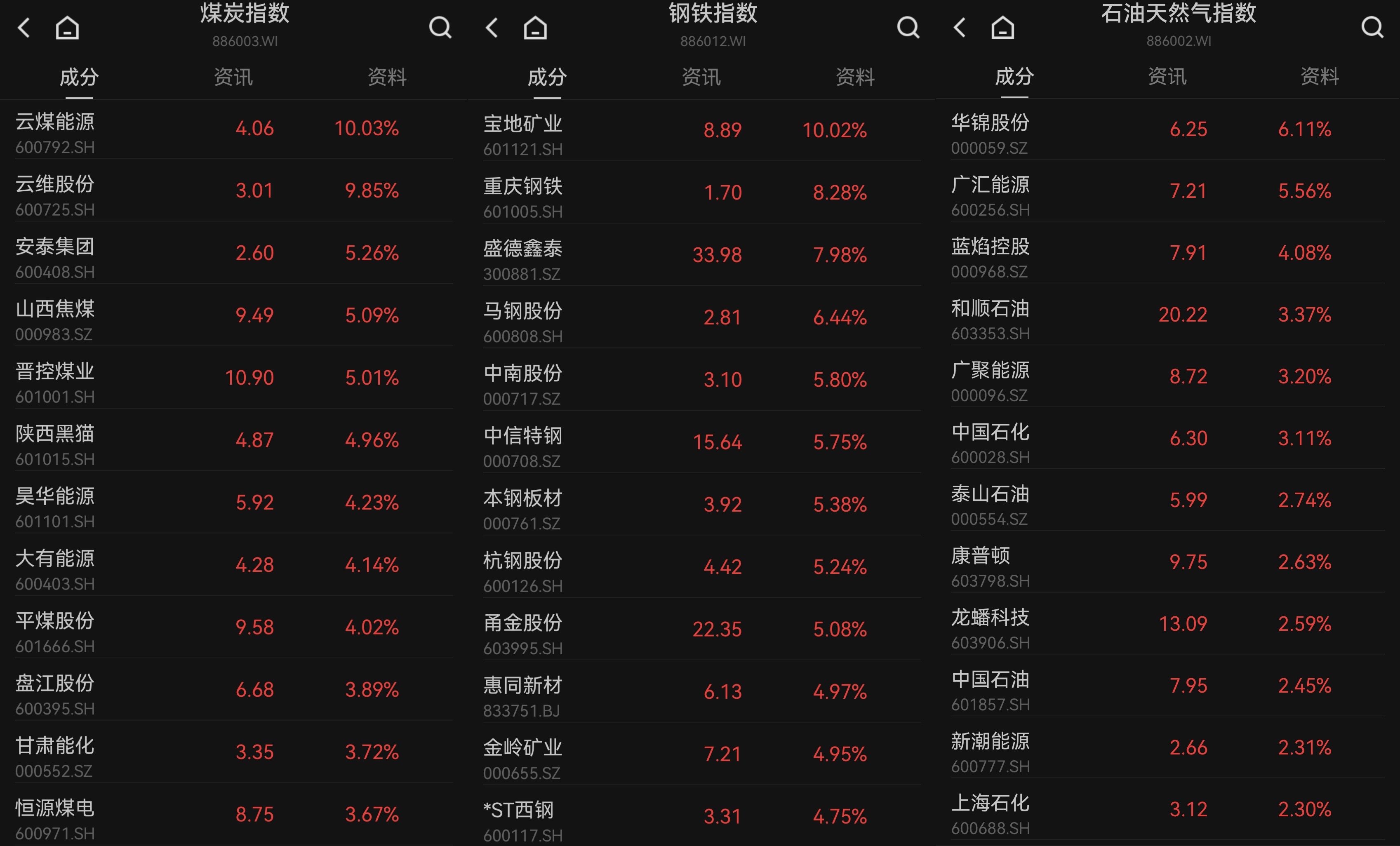油气、煤炭、有色、钢铁等周期股全线拉升,准油股份、宝地矿业、云煤能源、中润资源、北方铜业等多股涨停。