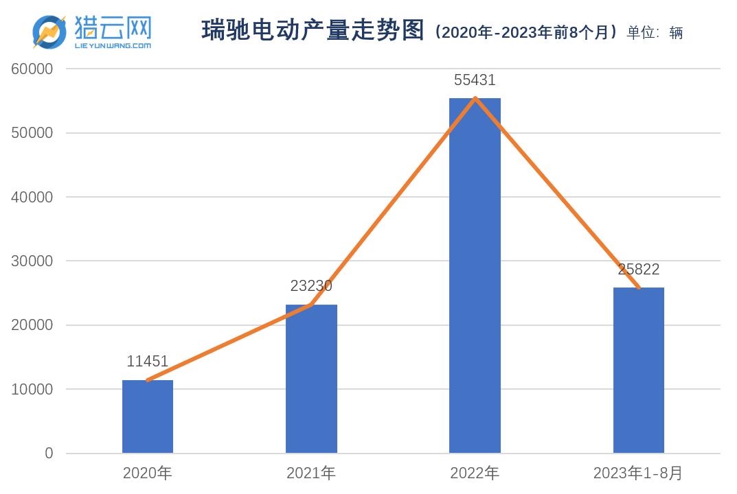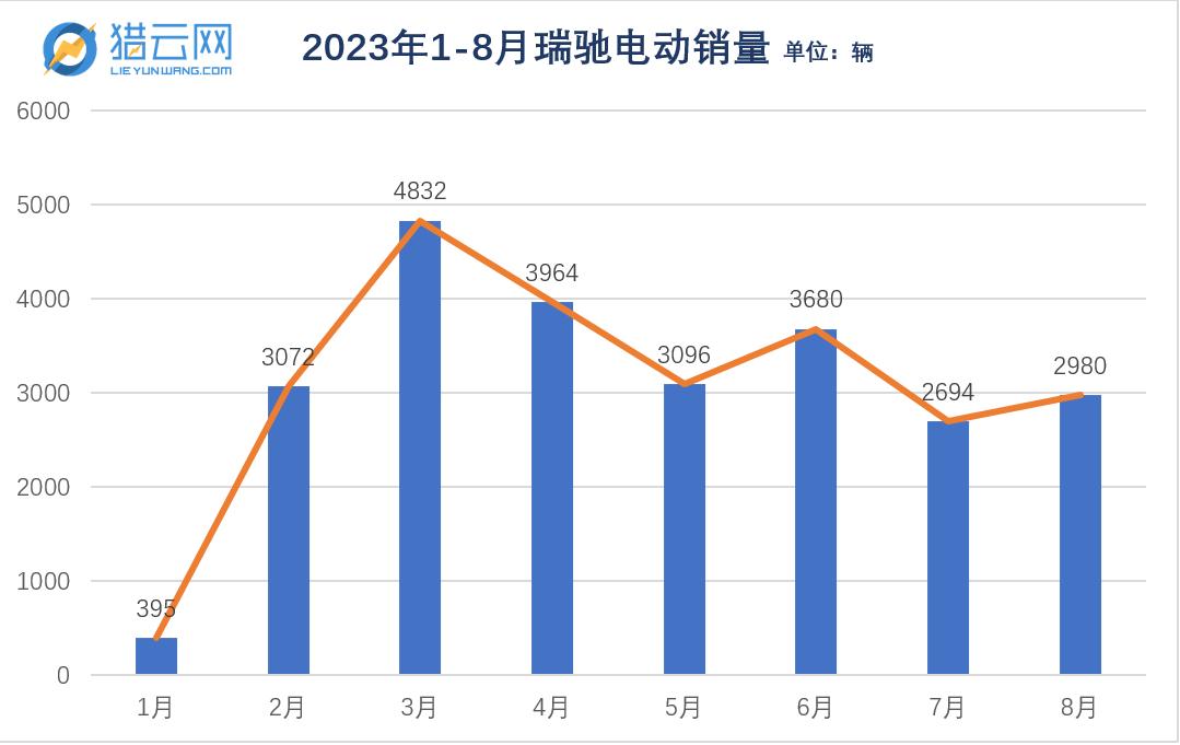纵向来看,自2023年以来的8个月,瑞驰电动的销量分别为395、3072、4832、3964、3096、3680、2694、2980。