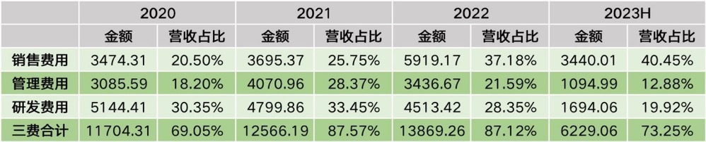 在2020年至2022年间,「有米科技」大幅提高了上述三费的支出,费用支出占比达到营收的87%。在2023年上半年,其通过降低管理费用、研发费用,才最终使得三费占比有所下降,至73.25%。