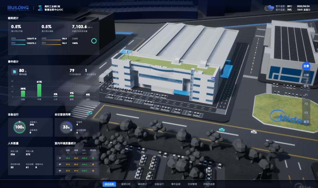 在美的工业园西区项目中,数字化纬度则打造iBUILDING智慧运营中心、碳管理平台、统一设备管理平台、智慧园区等系列产品,通过高效设备“硬低碳”和高效运维“软低碳”的方式帮助园区获得了LEED、WELL双金级认证。