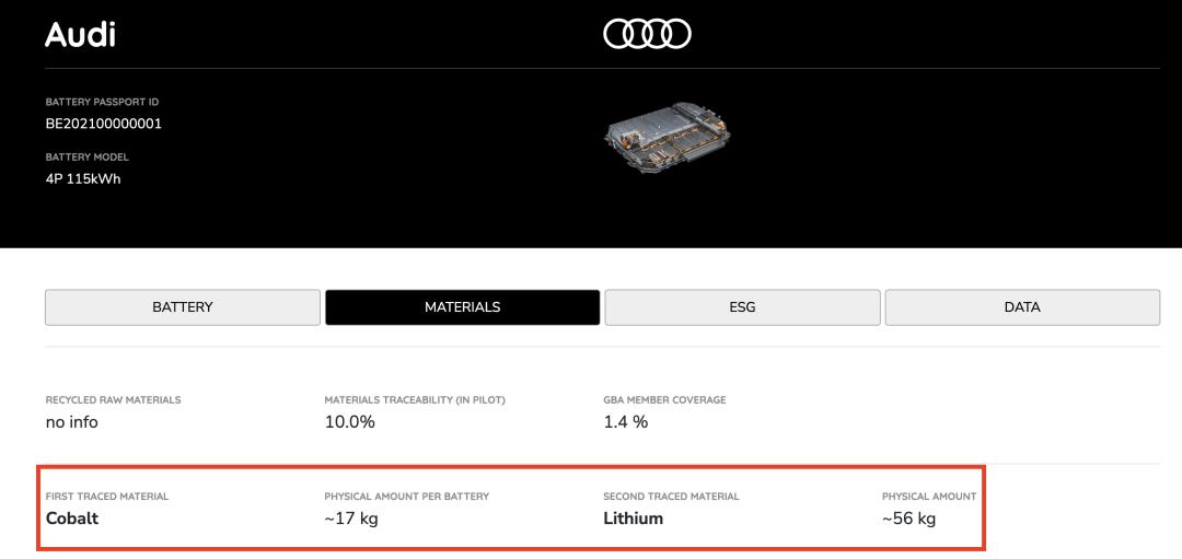 奥迪的电池护照中清楚显示了钴和锂的用量