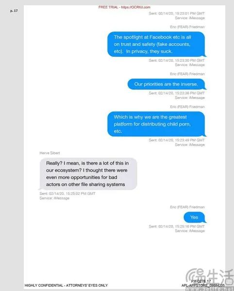 但苹果之所以做CSAM检测工具的直接原因,则有些让人啼笑皆非,却又在情理之中。对于Epic Games与苹果的诉讼,想必大家不会陌生,在这场围绕App Store垄断与否的诉讼中,Epic Games的律师还收集了大量与App Store无关的证据。比如说,他们找到了苹果反欺诈技术部门“FEAR”负责人Eric Friedman的一段工作聊天,其中就显示,“我们(苹果)是全世界最大的儿童色情内容分发平台。”