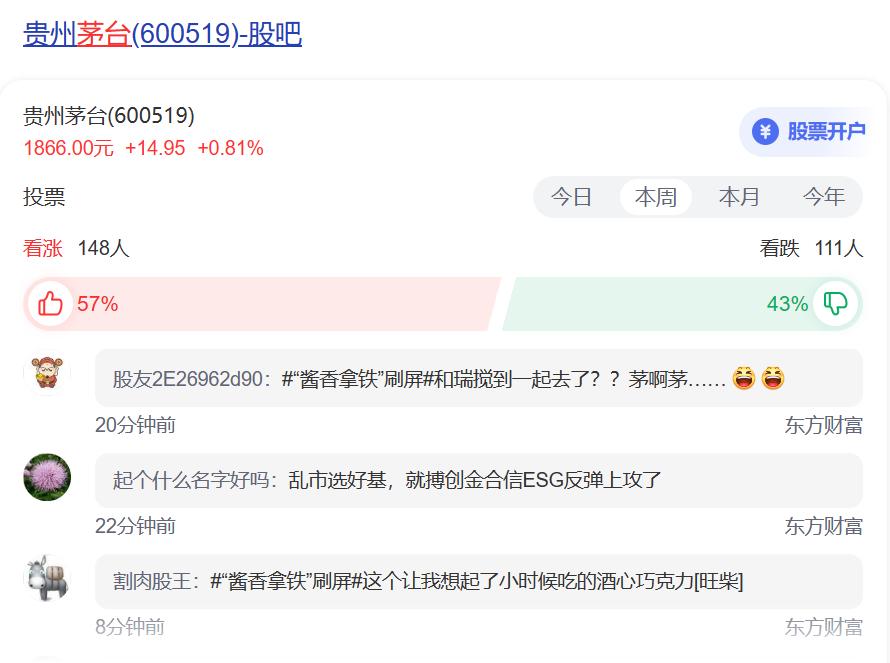 这次联名有多出圈呢,除了在微博抖音小红书上声量大,贵州茅台股吧里的老哥们也在激情讨论。