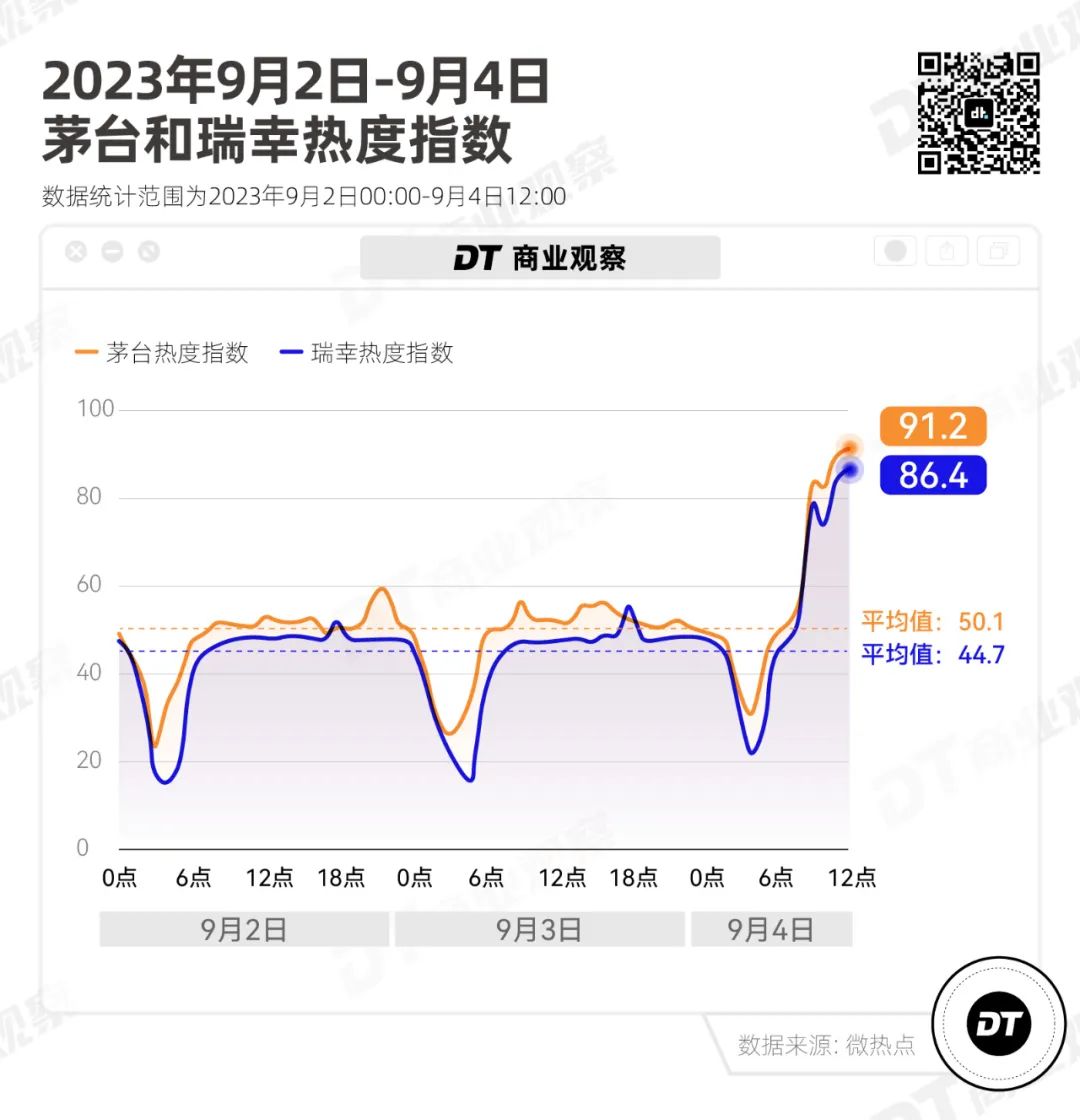 根据微热点数据,茅台和瑞幸的热度指数都在今天上午12点达到近三天峰值,分别是91.2和86.4,和平均热度相比,分别增长了82.0%和93.3%。