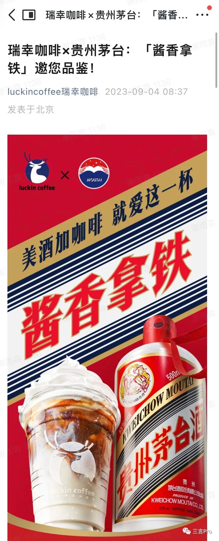 今天,瑞幸咖啡上线了和茅台联名合作的“酱香拿铁”,一经发售迅速成为爆款。