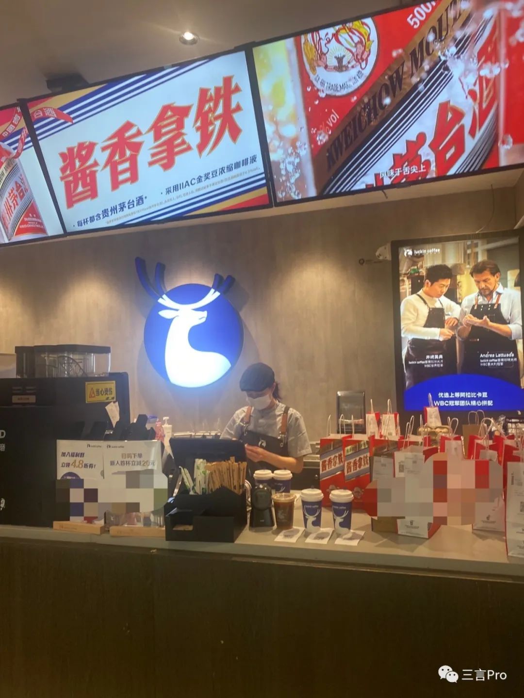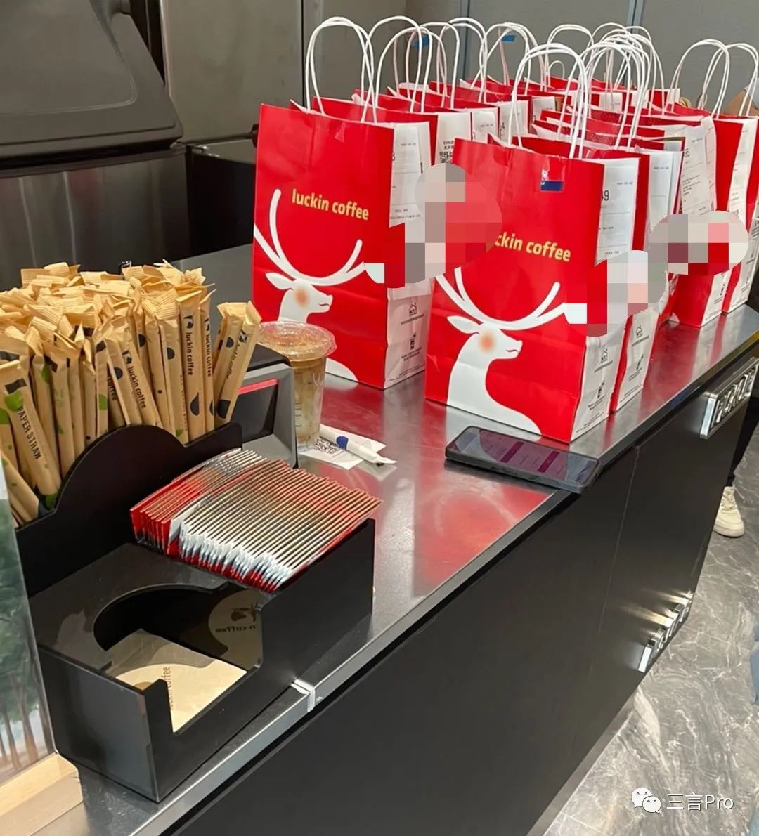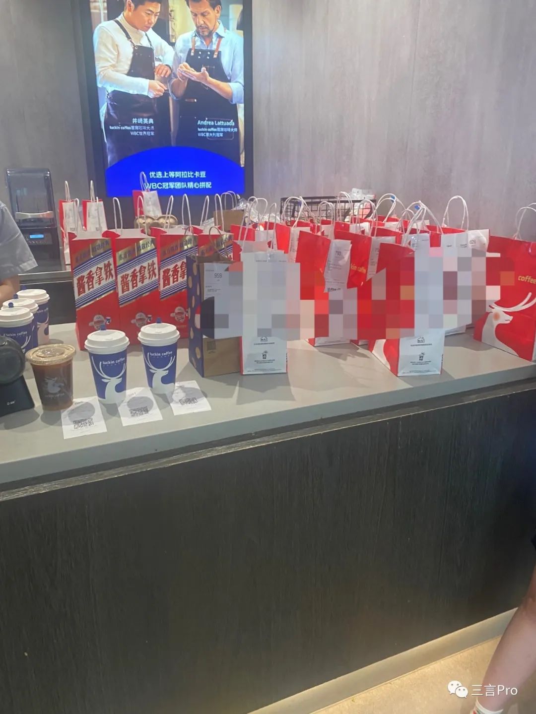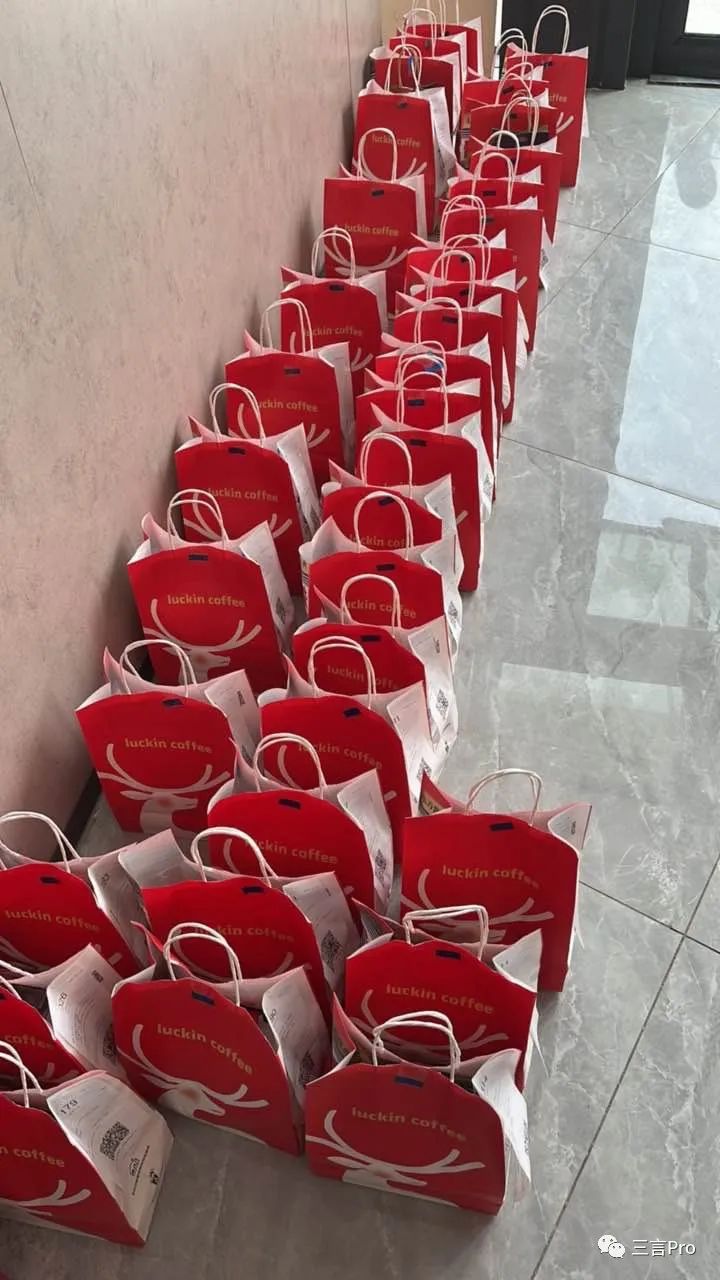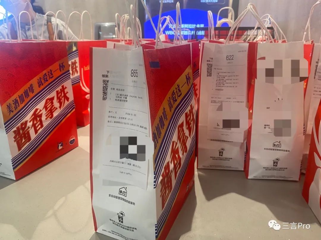 很多门店门口摆满了瑞幸和茅台联名的手提袋;