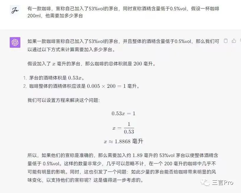 有好事者使用AI大模型产品计算茅台酒含量,而AI给出的结论是每200ml中包含约1.88ml的茅台酒。