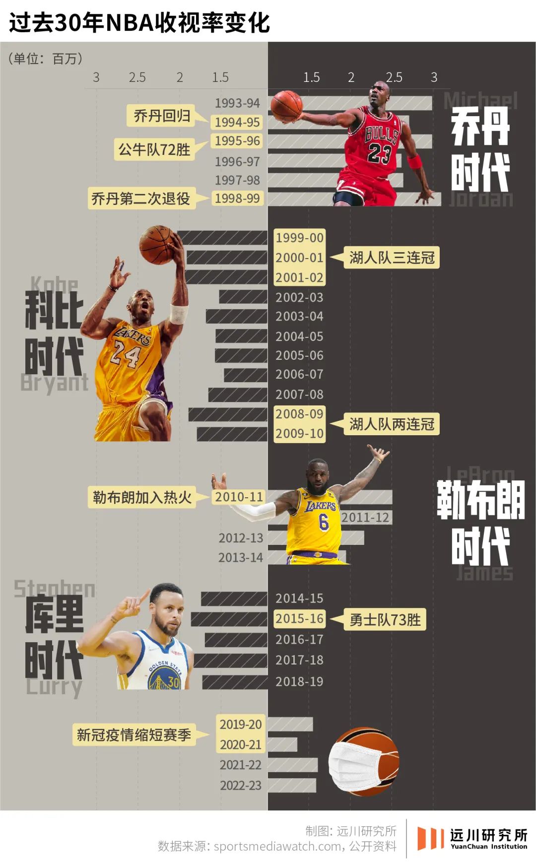 NBA的影响力正在逐年下降,而乔丹、科比、勒布朗、库里之后,不知还有谁能扛起那个全球文化符号的大旗。
