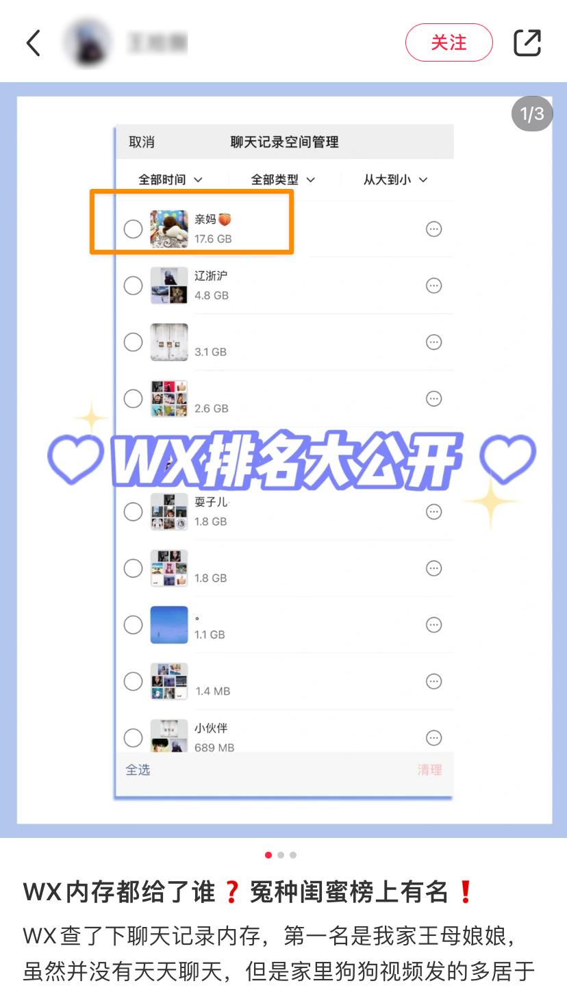 比如这位网友和亲妈的聊天内容,就占掉了 17 GB 空间,这孝顺程度,让平时只和爸妈视频的世超都有点惭愧。