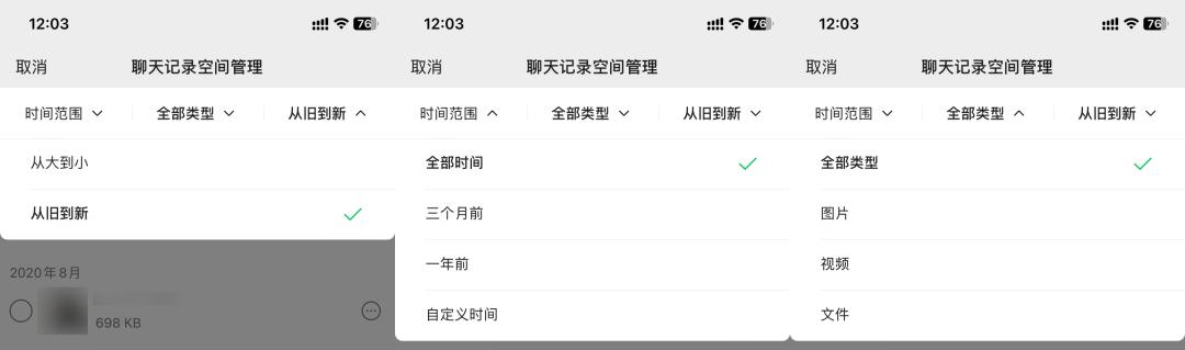 聊天记录这块,你可以按照图片、视频、文件分别清理。清理时,也能按照时间范围,大小排序,新旧排序。