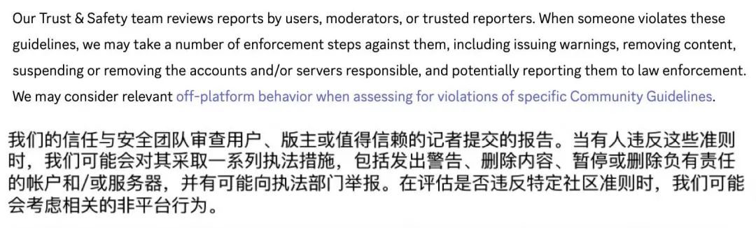Discord 的信任与安全团队,负责检查用户、版主或记者的报告,如果有人确实违反了社区准则,那就发出警告、删除内容、关停账号等,存在一定的被动性。