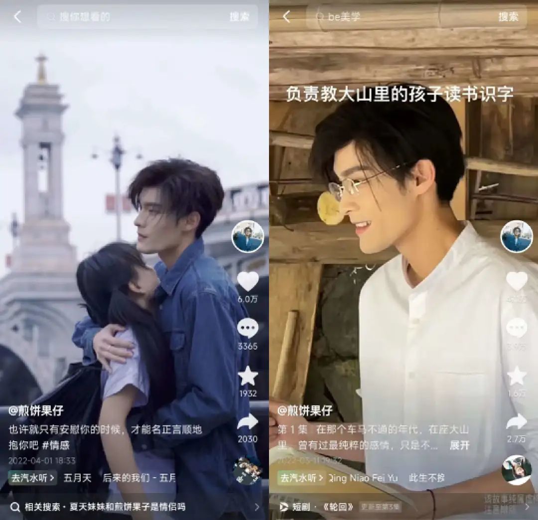 查看“煎饼果仔”的抖音账号发现,在2021年之前,“煎饼果仔”的多数视频以展示颜值为主,直到2021年下半年开始,“煎饼果仔”才开始以演员身份,尝试青春年少、家国情怀等剧情。