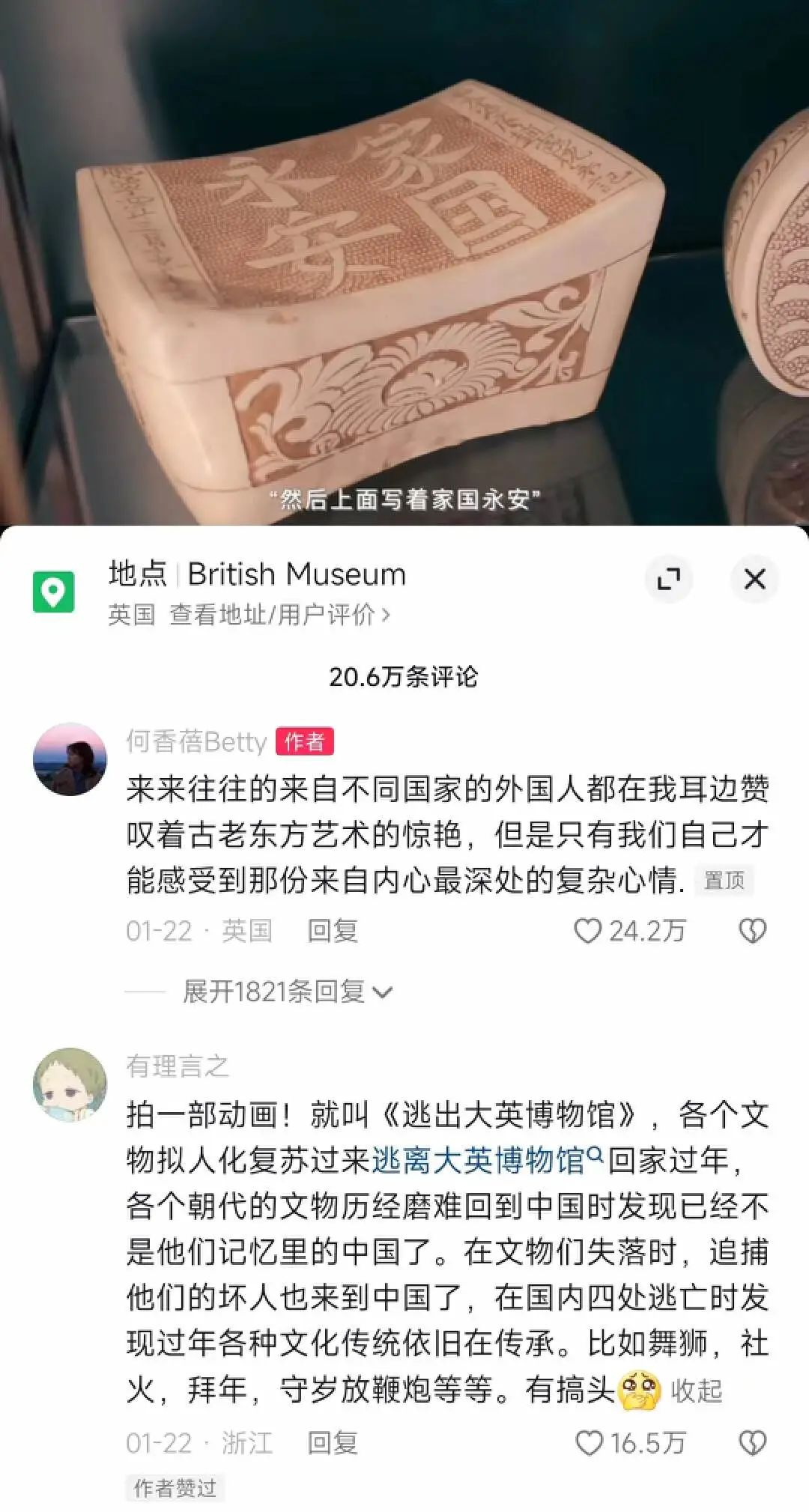 1月11日,“何香蓓Betty”以颇为复杂的心情拍摄了在大英博物馆的见闻。视频在抖音发布11天后,网友“有理言之”留言,希望拍一部动画,让拟人化的文物逃离大英博物馆回家过年。