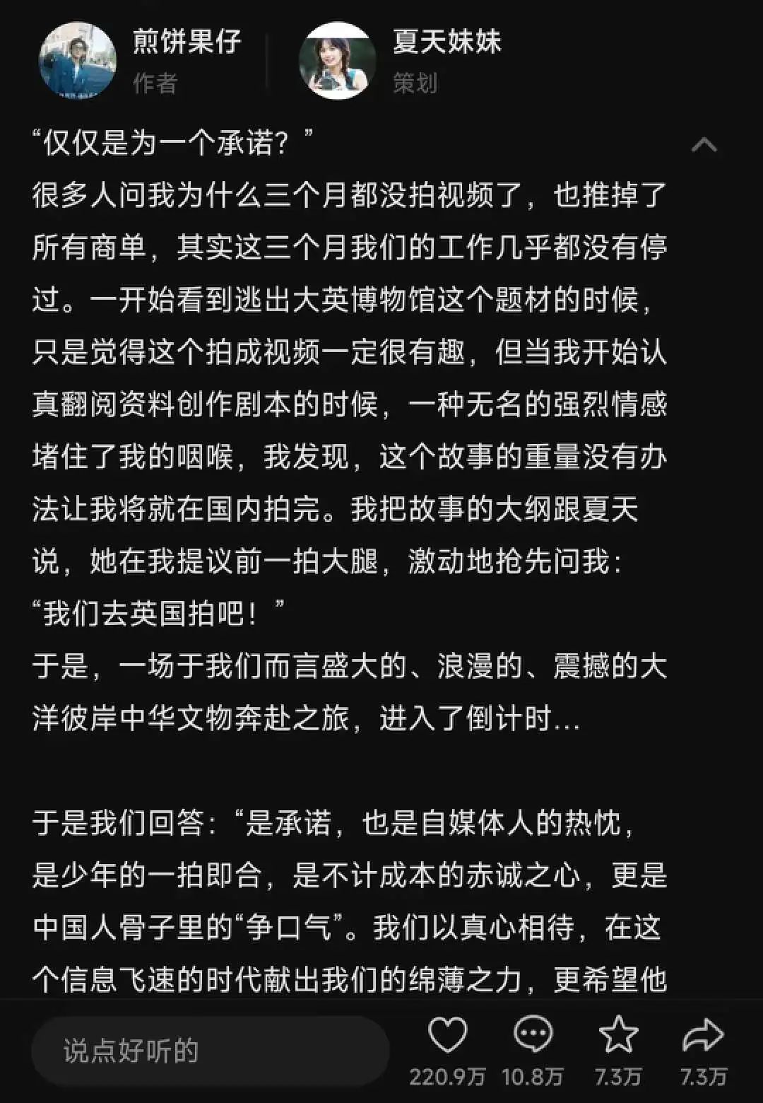 关于《逃出大英博物馆》,“煎饼果仔”曾发文表示,最初他只是觉得这个故事拍成视频一定很有趣,但当他认真翻阅资料创作剧本时,“一种无名的强烈情感堵住了咽喉”。
