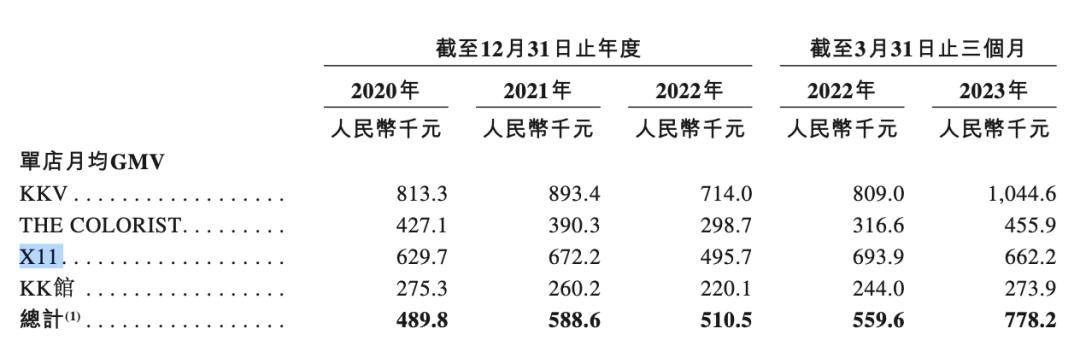 招股书显示了按零售品牌划分的单店月均GMV(交易额)详情,其中X11在2022年的单店月均GMV为49.57万,截至今年3月31日止的三个月,对应数据为66.22万。2020和2021年也在60多万。
