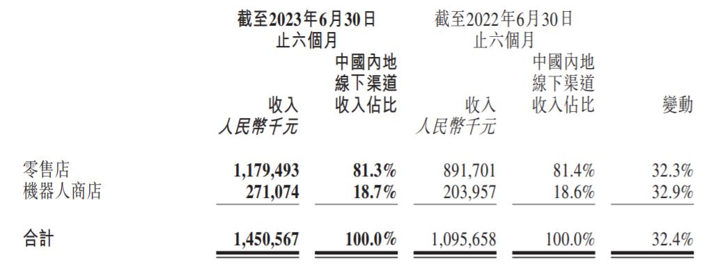 从收入渠道来看,内地各个渠道总收入占泡泡玛特上半年收益的86.6%,合计收入24.38亿元。线下渠道收入14.51亿元,同比增长32.4%,其中零售店收入11.80亿元,机器人商店收入2.71亿元。