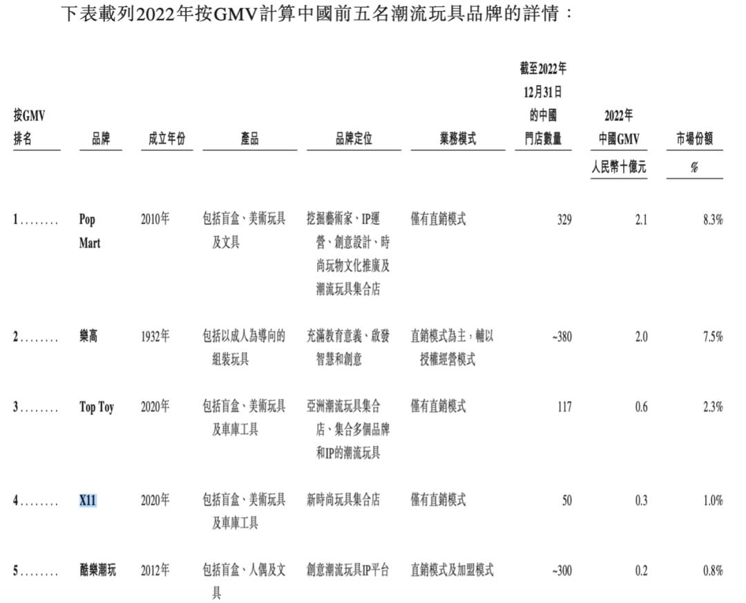 KK集团于2020年初推出X11品牌,招股书显示该品牌仍处于成长初期,但近年来发展迅速,于中国潮流玩具零售商中位居前五,按GMV计算,2022年的市场份额约为1.0%。前三分别是泡泡玛特、乐高、TOP TOY,排名第五位的是酷乐潮玩,这几大品牌的市场份额分别为8.3%、7.5%、2.3%、0.8%;X11位居第四。