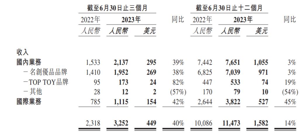 根据名创优品(TOPTOY)公布的截至2023年6月30日止的2023财年第四季度财报数据,2023年上半年,名创优品集团的总收入为62.06亿元,旗下潮玩品牌TOP TOY总营收3.11亿,同比增长51%。