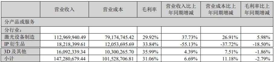 具体来看,金运激光旗下IP衍生品业务(IP小站)实现收入1821.8万元,同比减少55.13%;毛利率为33.84%,同比减少18.50%。