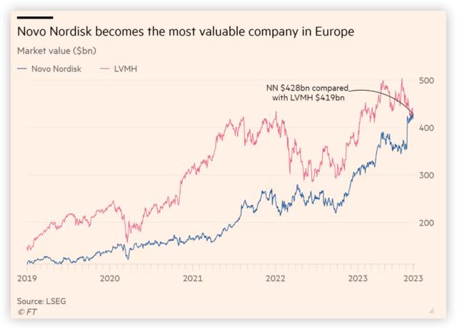 本周一,在诺和诺德减肥神药Wegovy进入英国市场这一消息刺激下,诺和诺德股价收盘上涨0.7%,市值达到4280亿美元。而奢侈品巨头LVMH集团股价则收跌0.4%,市值约为4190亿美元。减肥药终于战胜大牌包,稳定欧股市值第一宝座。
