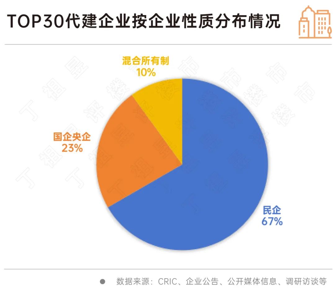 从TOP30上榜代建企业的性质来看,民企数量占比达67%,如龙湖龙智造、蓝城集团等;国企央企数量占比达23%,包括华润置地、招商蛇口等;混合所有制占比为10%,包含绿城管理、金地管理、万科三家企业。
