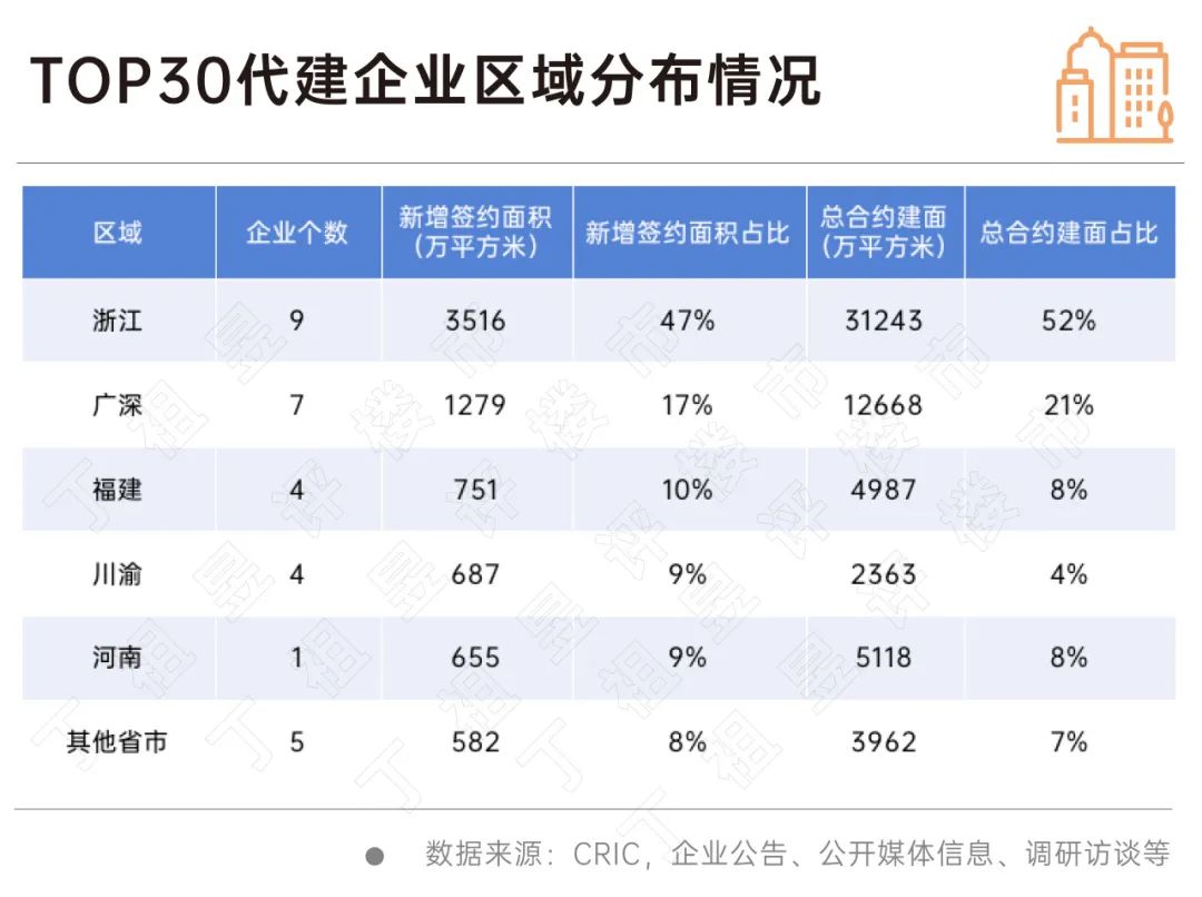 此外,来自于广深的代建企业也相对较多,总合约建筑面积占比达到了21%,新增签约规模占比17%,主要企业包括华润置地、金地管理、万科等。其余上榜企业则主要来自福建、川渝等地区。