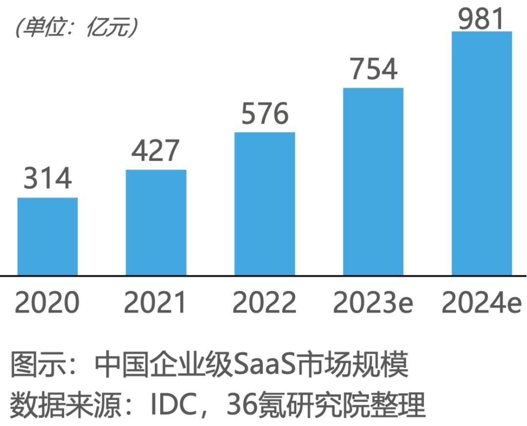 根据源于IDC、由36氪研究院整理的数据,2021年、2022年中国SaaS市场规模分别增长了35%和34%,对于B端产业来说,这算是一个不错的数字。