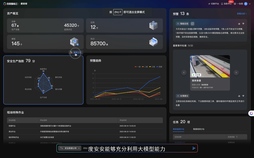在生产领域,百度发布的安全生产智能助手“度安安”,可以通过大模型学习、归类、总结各类安全预警信息,并用“人话”回答相关安全问题。在中海油宁波大榭石化的应用案例中,“度安安”将事故响应速度提升50%。