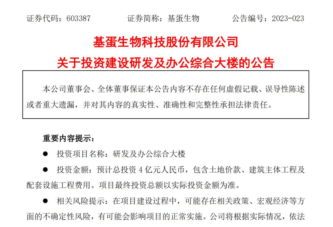 8月28日,上市公司基蛋生物发布公告称,公司拟投资建设研发及办公综合楼 ,预计总投资 4亿元 ,所有资金来源为自有资金,包含土地价款、建筑主体工程及配套设施工程费用。
