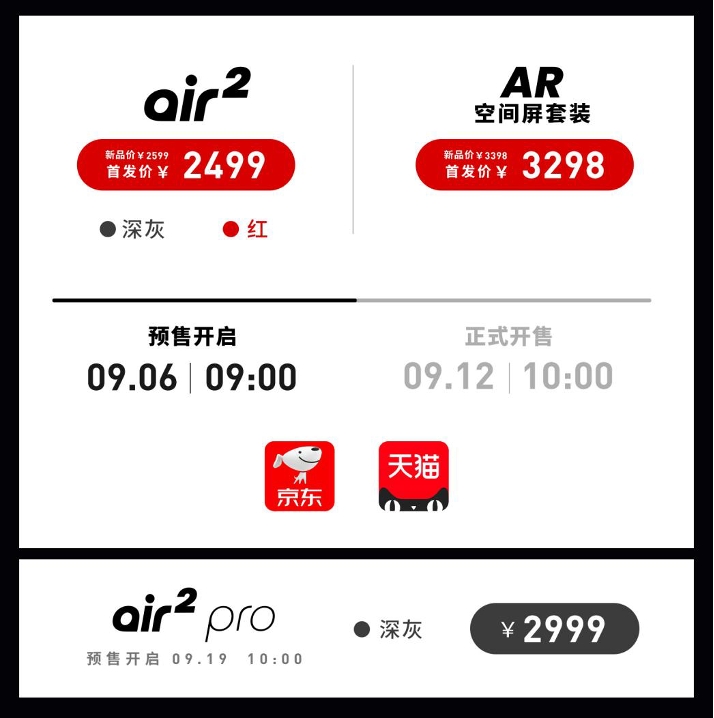 据悉,XREAL Air 2售价2599元,首发价2499元;XREAL AR空间屏套装售价3398元,首发价3298元,已于今天9点在天猫、京东同步开启预售。XREAL Air 2 Pro售价2999元,9月19日10:00开启预售。