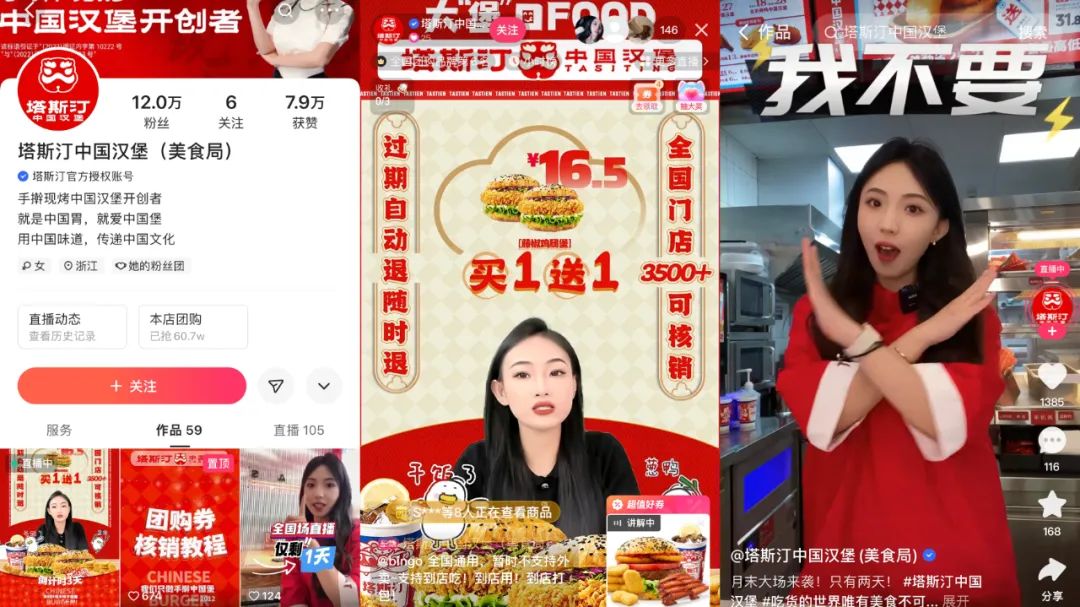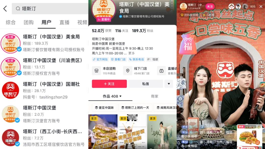 在抖音,塔斯汀开设了多个账号如塔斯汀( 中国汉堡 )美食局、塔斯汀( 中国汉堡 )福利社、塔斯汀( 中国汉堡 )国潮社等,接力直播,覆盖不同时间段,以最大程度承接平台流量。消费者在所有可能的用餐时间,都能快速找到直播间购买团购券。