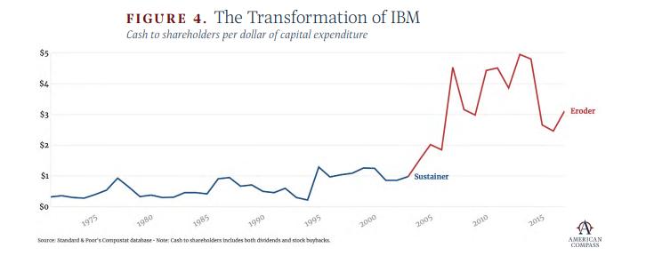 典型的比如蓝色巨人IBM , 1970年代的时候每1美元的资本开支 , 对应着给股东的回报只有30美分 。 可是进入2000年之后 , 每1美元的资本开支背后 , 就对应着2美元以上的股东回报 , 部分年份甚至接近5美元 。