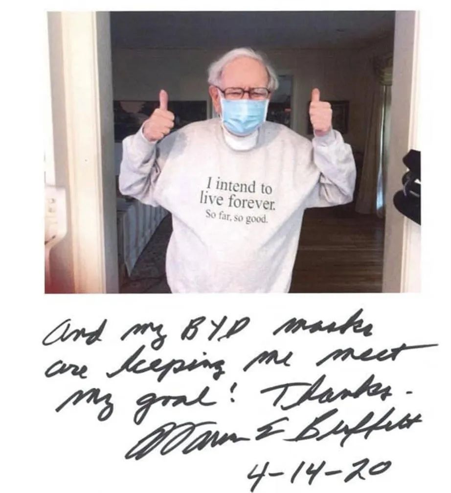 比亚迪也许不符合巴菲特的投资原则 , 但巴菲特对比亚迪这家公司 , 对王传福这个创业者始终表现出了充分的尊重 。 2008年以后每年的股东大会上 , 巴菲特一直都为比亚迪站台 。 在2020年4月 , 因为加州疫情 , 巴菲特晒出了自己的比亚迪口罩 : “ 我的目标是长命百岁" , 并且手写了 ” 比亚迪口罩更是祝我一臂之力 “ 。 真的是掩饰不住对比亚迪的欣赏 。