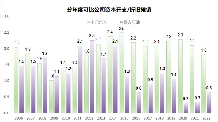 衡量资本开支的强度有一个指标 , 就是资本开支/折旧摊销 , 丰田的这个比例一直在2左右 , 但是对于西方石油公司来说 , 这个比值最近几个年份一直都在1以下 , 也就是说西方石油公司可以将盈利通畅的转化成现金流 , 但丰田不可以 。