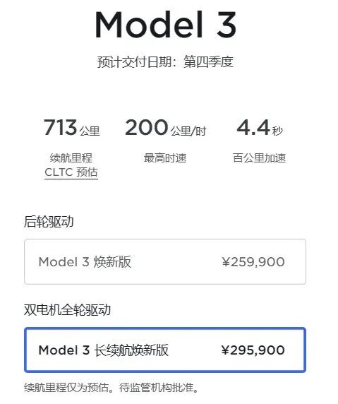 其他方面包括美学设计、驾驶体验、座舱设计等据官方介绍都是全方位焕新。尤其值得一提的是,性能上新款Model 3长续航版本有713公里(CLTC预估值)最高续航,适合长途自驾,能有效地缓解充电焦虑问题。