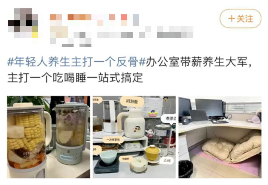 有网友晒出自己的办公桌:焖泡壶、一次性茶包、煮茶壶、盖碗......办公室带薪养生,主打吃喝睡一条龙服务。