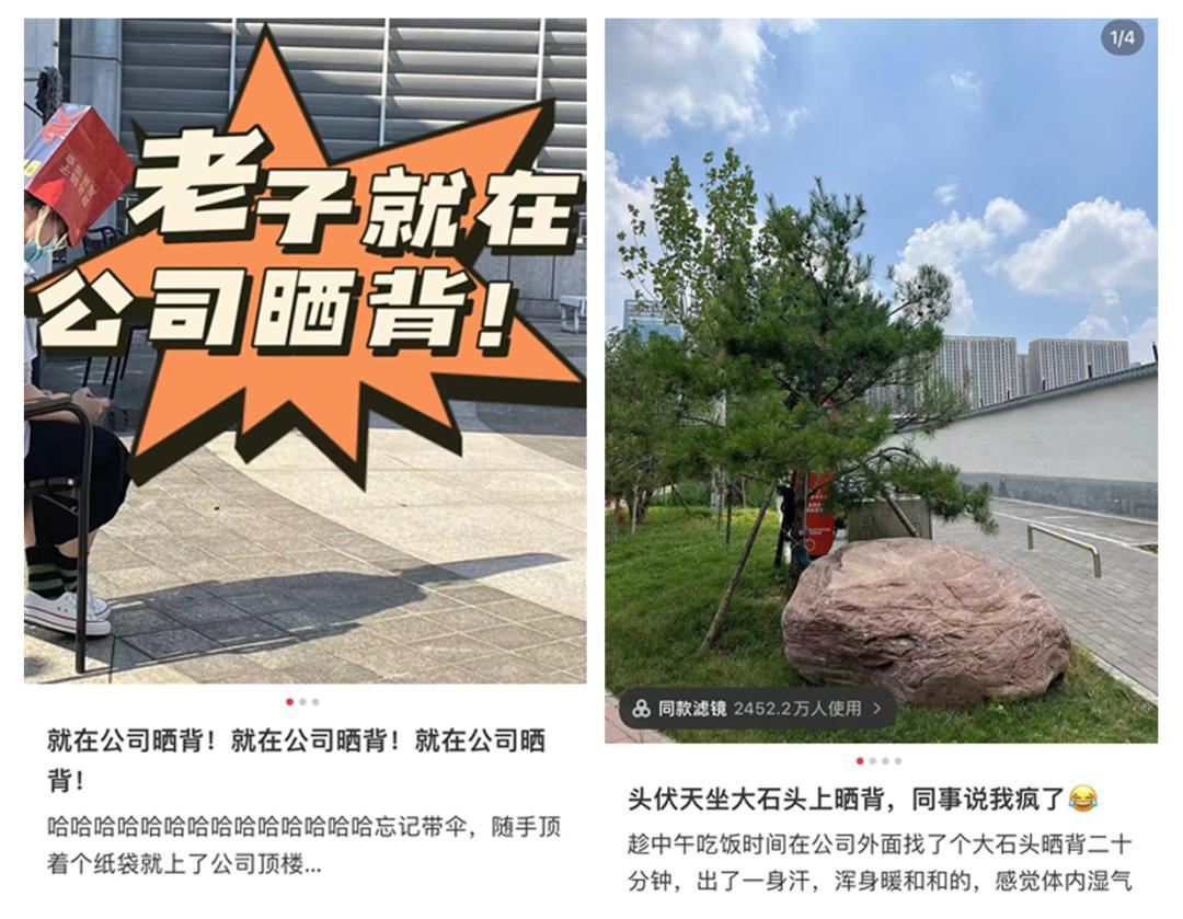 走到公司顶楼,纸袋头上一戴,晒背开始;路过附近大石头,屁股一坐,晒背进行,主打就是一个随时随地养生!