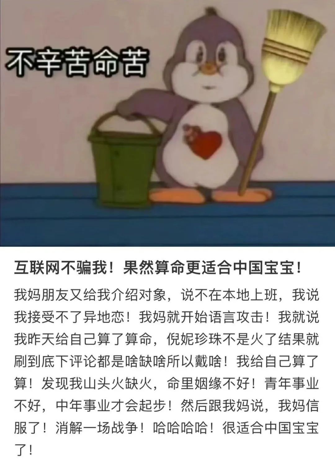 除此之外,周易还能调节家庭矛盾。有网友说,因为被父母催婚太紧,突发奇想算了个命,算出命里姻缘不好,瞬间说服父母,免于催婚催生,拯救自己于水火!