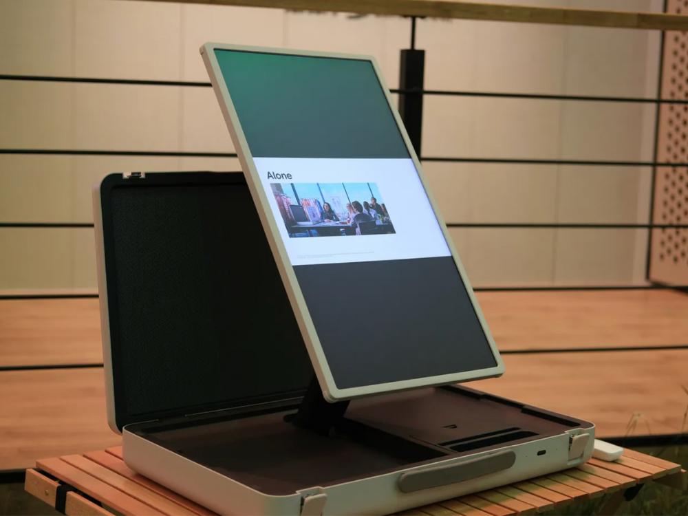 在会场展示模型中,该手提箱电视并未搭载针对触摸屏优化的游戏。除此之外,该电视配备了铰链设计,整体屏幕可以横屏或竖屏观看。
