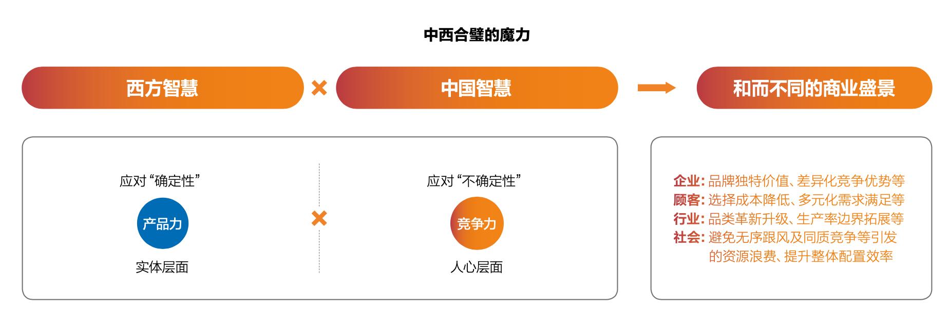 西方智慧和中国智慧,对应到商业领域、应用到企业层面,其所产生的作用力往往是不同的。在我看来,西方智慧更多是作用于产品力,中国智慧则更多的是作用于是竞争力。缘由在于:西方的“数”的思维带来了科技的力量,生产出更多新工具,创造出更多新产品,与之伴随的还有技术发展下的模仿、复制成风,由此加速同质化竞争,引发的价格战无不钳制行业良性发展。要解决竞争问题,光靠物理层面的产品还不够,还得通过人心层面的“品牌”这一桥梁才能达到目的——品牌之所以成为品牌,不仅在于它代表某种差异化价值,更是因为它将企业所生产的有形产品汇聚成了一种无形的、长期的、认同的力量。